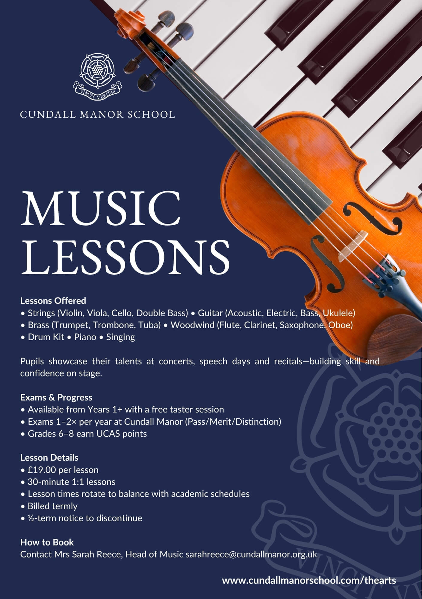 Around 200 individual instrumental, singing and drama lessons take place every week, and many pupils are invited to participate in ensembles or as soloists at the various events that take place throughout the year. Exams are offered with the ABRSM, LAMDA, Rock School and Music Teachers’ exam boards.